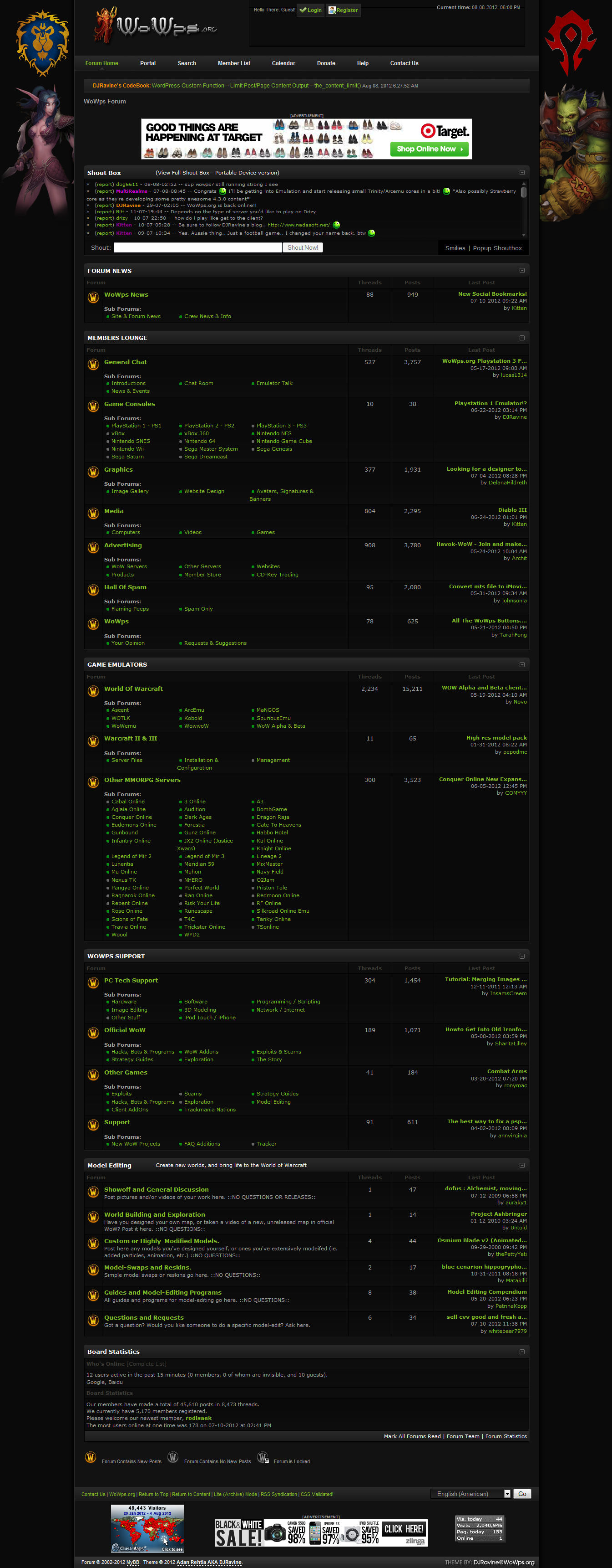 The heart of the community. Originally powered by vBulletin, later migrated to MyBB in June 2012 — carrying over 98,960 registered users. The forums hosted 8,455 threads and 45,593 posts across 12 categories including 5 emulator sections, Model Editing, Project: Genocide, and Covert Ops. A casino plugin offered blackjack, poker, and a lottery. The shoutbox captured real-time community moments from 2012 to 2015.